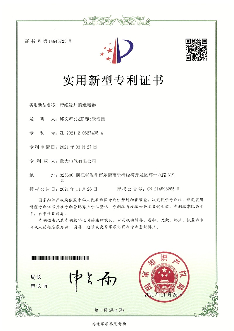 [專(zhuān)利證書(shū)]帶絕緣片的繼電器(實(shí)用)