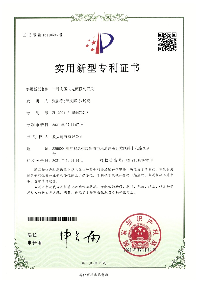 [專(zhuān)利證書(shū)]一種高壓大電流微動(dòng)開(kāi)關(guān)(實(shí)用)