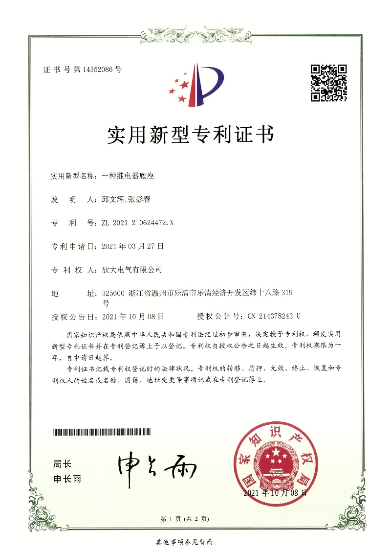[專(zhuān)利證書(shū)]一種繼電器底座(實(shí)用)