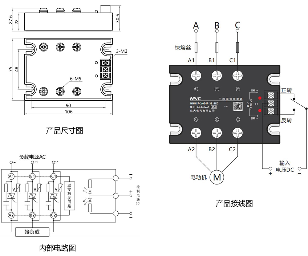 產(chǎn)品技術(shù)參數(shù)控制電壓 024:12-32VDC 控制電流 ≤60mA 接通電壓 12VDC 關(guān)斷電壓 5VDC 反向電壓 32VDC 負(fù)載電壓 24-440VAC 負(fù)載電流 10A、15A、20A、25A、30A、40A 瞬態(tài)電壓 900VAC 通態(tài)壓降 ≤1.6VDC 通斷時間 ≤10ms 正反轉(zhuǎn)延時時間 ≥200ms 斷態(tài)漏電流 ≤10mA 介質(zhì)耐壓 ≥2500VAC 絕緣電阻 100MΩ,500VDC 測試 環(huán)境溫度 -30~80℃ 安裝形式 螺栓安裝 產(chǎn)品重量 ≈340g 外形尺寸 106×75×30.6mm 說明 負(fù)載5A 以上必須安裝散熱器,60℃以上必須加風(fēng)扇強冷或者水冷 產(chǎn)品尺寸及接線方式