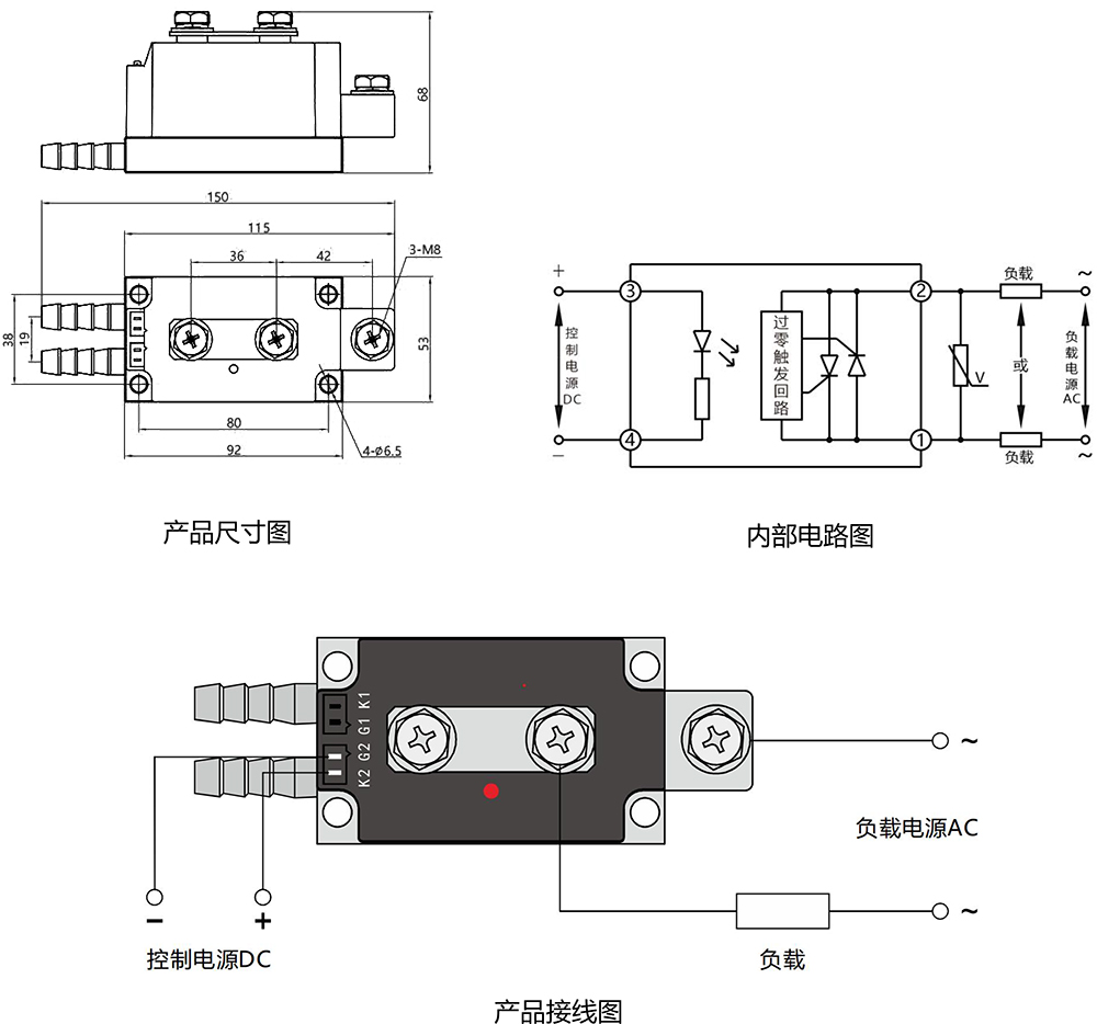 產(chǎn)品技術(shù)參數(shù)控制電壓 3-32VDC 控制電流 5-25mA 接通電壓 3VDC 關(guān)斷電壓 1VDC 反向電壓 32VDC 負(fù)載電壓 60-1200VAC 負(fù)載電流 500A、600A 瞬態(tài)電壓 1600VAC 通態(tài)壓降 ≤1.6VDC 通斷時間 ≤10ms 斷態(tài)漏電流 ≤10mA 介質(zhì)耐壓 ≥2500VAC 絕緣電阻 100MΩ,500VDC 測試 環(huán)境溫度 -30~80℃ 安裝形式 螺栓安裝 產(chǎn)品重量 ≈1160g 外形尺寸 150×53×68mm 說明 負(fù)載5A 以上必須安裝散熱器,60℃以上必須加風(fēng)扇強冷或者水冷 產(chǎn)品尺寸及接線方式