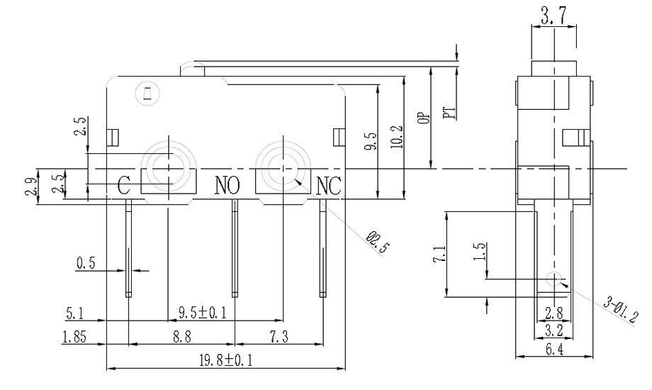 NL-5T-F3OF 動(dòng) 作 力 0.8±0.3 1.5±0.4 2.3±0.4 3.2±0.5 RF 釋 放 力 最小0.15N 最小0.35N 最小0.55N 最小0.55N PT 工作行程 最大0.6mm 最大0.6mm 最大0.6mm 最大0.6mm OT 超越行程 最小0.5mm 最小0.5mm 最小0.5mm 最小0.5mm MD 差動(dòng)行程 最大0.2mm 最大0.2mm 最大0.2mm 最大0.2mm OP 動(dòng)作位置 8.55±0.2mm