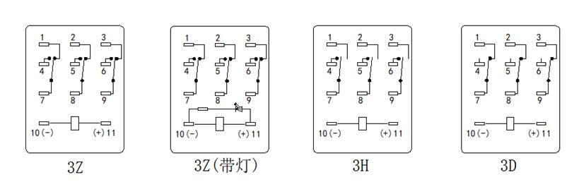 ⑤ 觸點形式:3H= 3組常開型 H;3D= 3組常閉 D; 3Z= 3組轉(zhuǎn)換型 Z