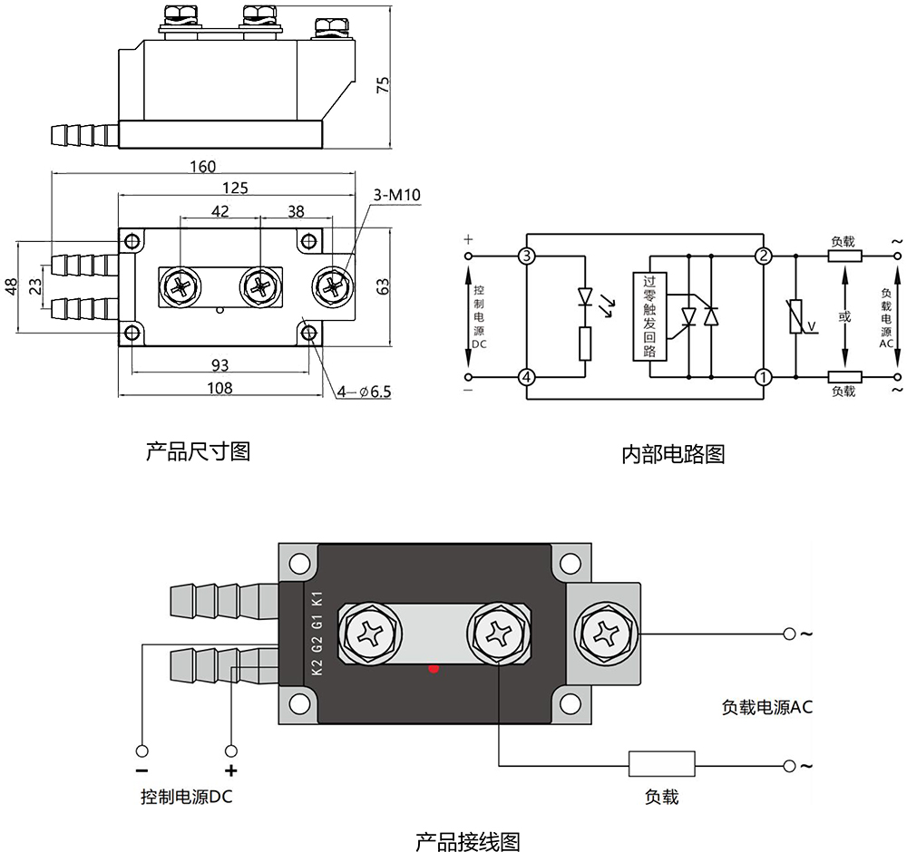 產(chǎn)品技術(shù)參數(shù)控制電壓 3-32VDC 控制電流 5-25mA 接通電壓 3VDC 關(guān)斷電壓 1VDC 反向電壓 32VDC 負(fù)載電壓 60-1200VAC 負(fù)載電流 800A 瞬態(tài)電壓 1600VAC 通態(tài)壓降 ≤1.6VDC 通斷時(shí)間 ≤10ms 斷態(tài)漏電流 ≤10mA 介質(zhì)耐壓 ≥2500VAC 絕緣電阻 100MΩ,500VDC 測試 環(huán)境溫度 -30~80℃ 安裝形式 螺栓安裝 產(chǎn)品重量 ≈1740g 外形尺寸 160×63×75mm 安裝尺寸