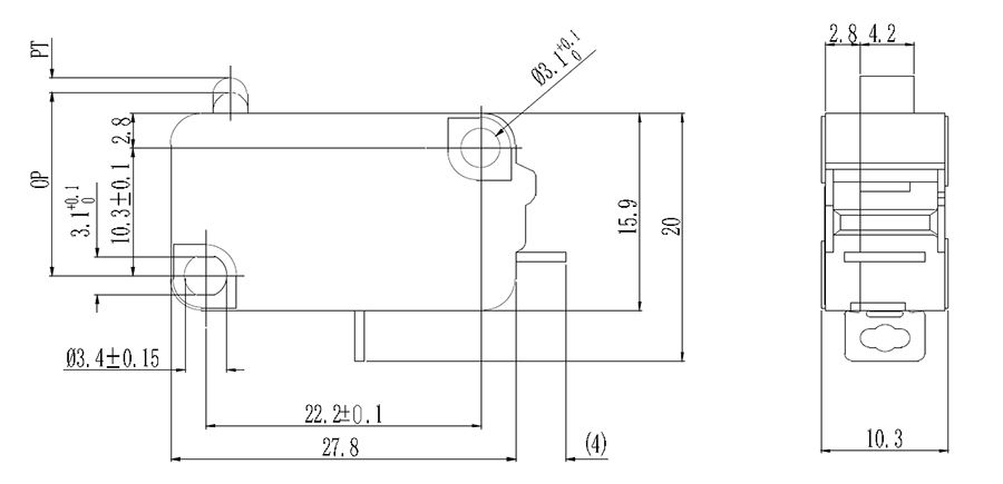 動(dòng)作特性\型號(hào) NV-21-3A6-D006 NV-16-3A5-D006 NV-16-3A4-D006 OF 動(dòng)作力 最大3.92N 最大1.96N 最大0.98N RF 釋放力 最小0.78N 最小0.49N 最小0.2N PT 工作行程 最大1.2mm OT 超越行程 最小1.0mm MD 差動(dòng)行程 最大0.4mm OP 動(dòng)作行程 14.4±0.4mm
