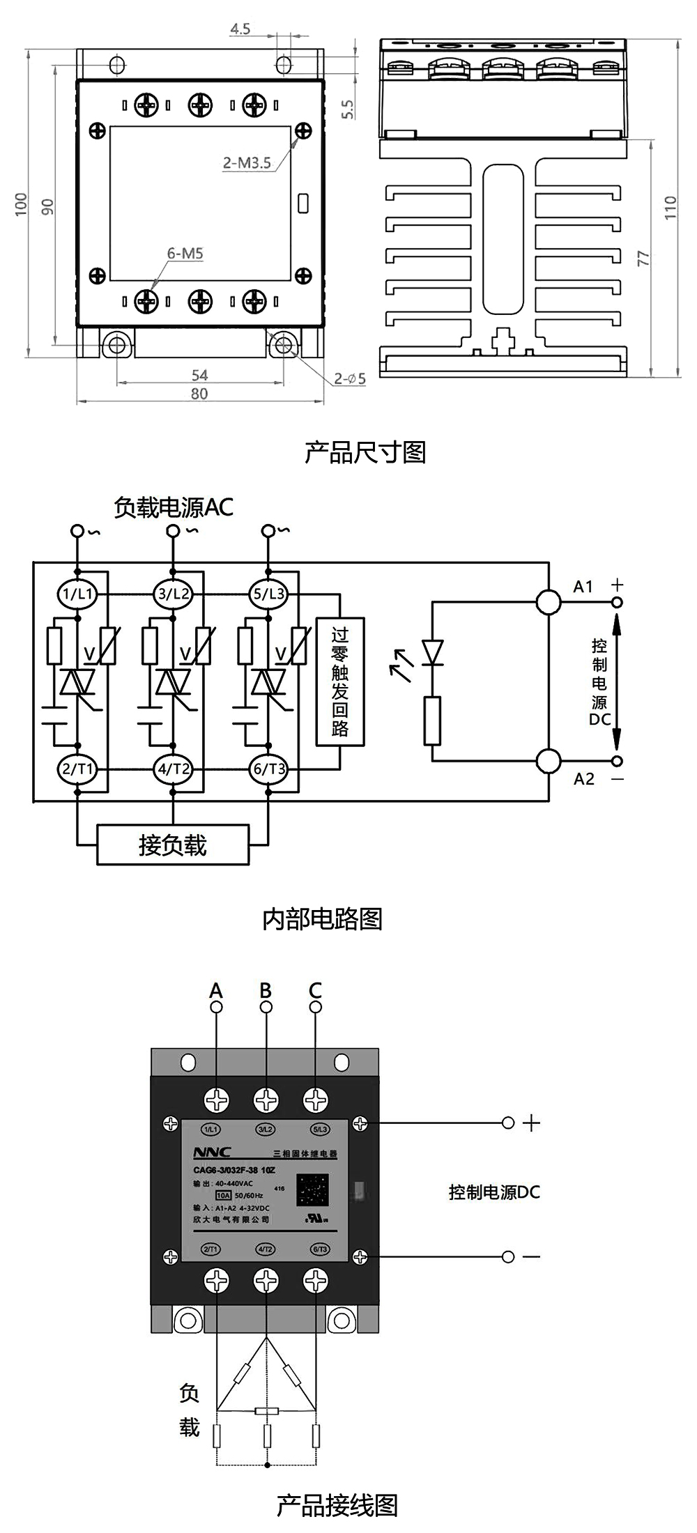 ①三相交流電路的進(jìn)線無相序要求,導(dǎo)線粗細(xì)按實(shí)際使用電流選擇。輸出端接負(fù)載。