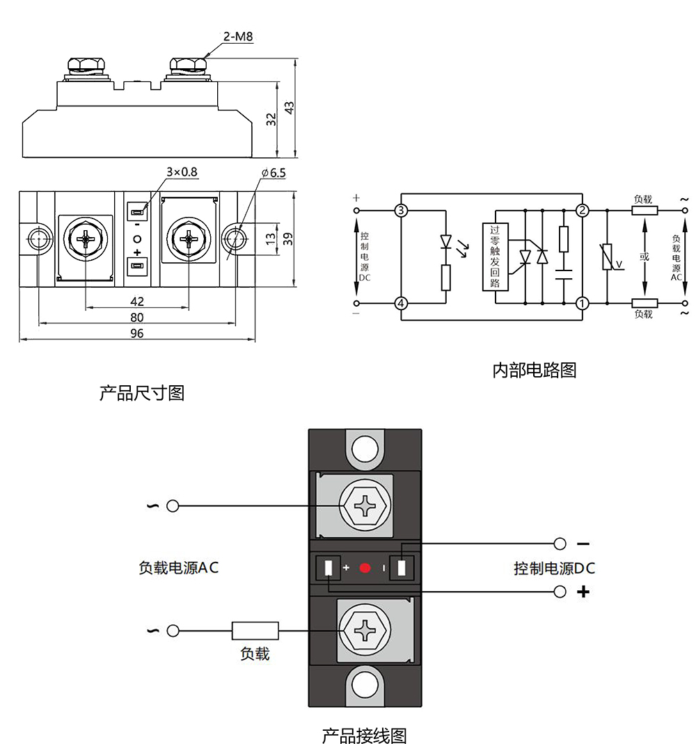 產(chǎn)品技術(shù)參數(shù)控制電壓 3-32VDC 控制電流 5-25mA 接通電壓 3VDC 關(guān)斷電壓 1VDC 反向電壓 32VDC 負(fù)載電壓 40-440VAC 負(fù)載電流 400A 瞬態(tài)電壓 1100VAC 通態(tài)壓降 ≤1.6VDC 通斷時(shí)間 ≤10ms 斷態(tài)漏電流 ≤10mA 介質(zhì)耐壓 ≥2500VAC 絕緣電阻 100MΩ,500VDC 測試 環(huán)境溫度 -30~80℃ 安裝形式 螺栓安裝 產(chǎn)品重量 280g 外形尺寸 96×39×43mm 說明 負(fù)載5A 以上必須安裝散熱器,60℃以上必須加風(fēng)扇強(qiáng)冷或者水冷 產(chǎn)品尺寸及接線方式